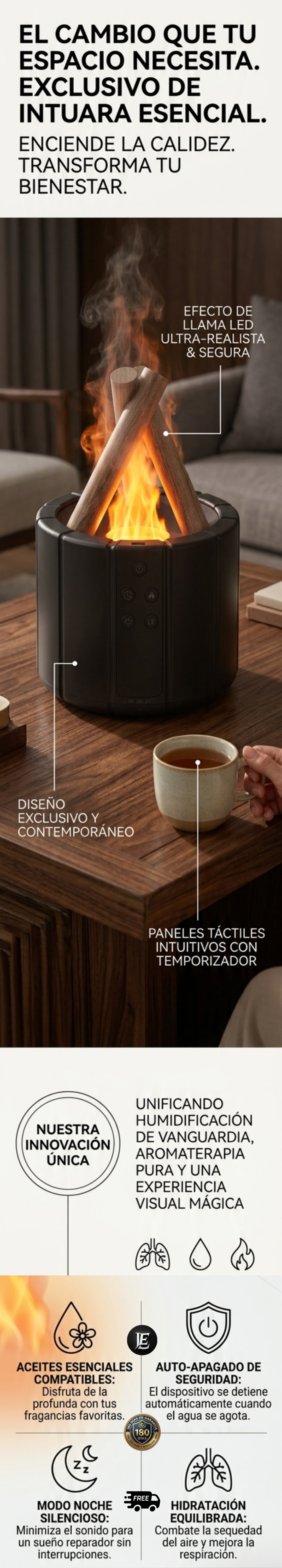 No, es completamente seguro. El efecto de llama hiperrealista se genera mediante tecnología ultrasónica que ilumina el vapor de agua frío con luces LED. No emite calor real, por lo que es seguro al tacto y para ambientes con niños o mascotas.