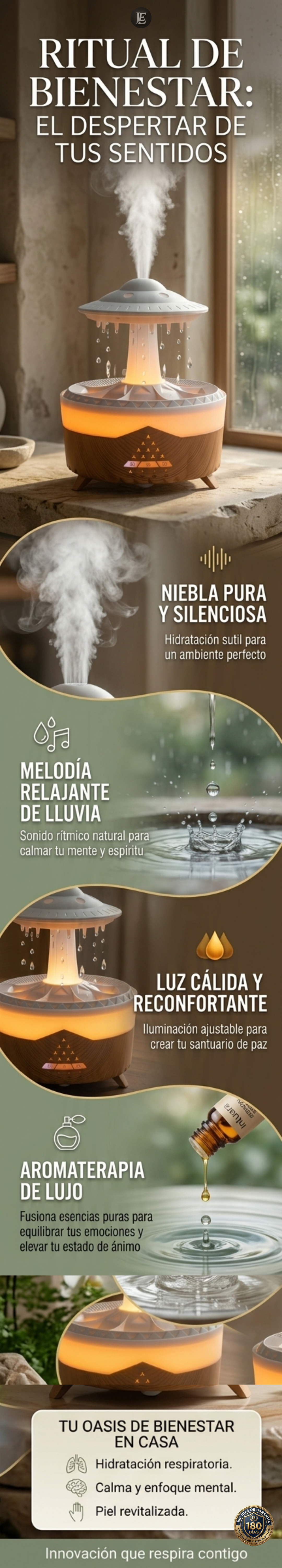 Este modelo exclusivo combina la humidificación ultrasónica con un sistema de goteo que simula una lluvia relajante. La niebla emerge de la parte superior, creando una atmósfera mística y única, ideal para reducir el estrés y decorar espacios modernos.
