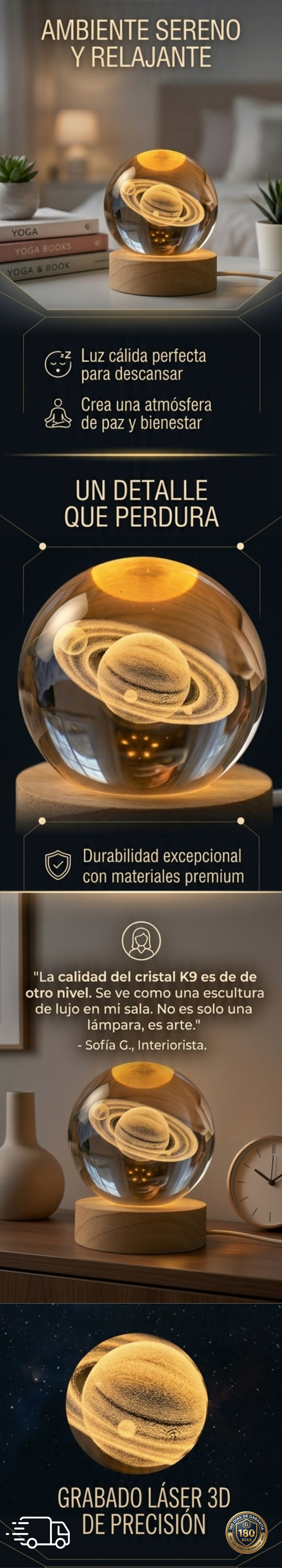 El diseño de Saturno está grabado con tecnología láser de alta precisión dentro de una esfera de cristal sólido. Al encender la base LED, la luz resalta los detalles del planeta y sus anillos, creando una ilusión tridimensional nítida y fascinante.
