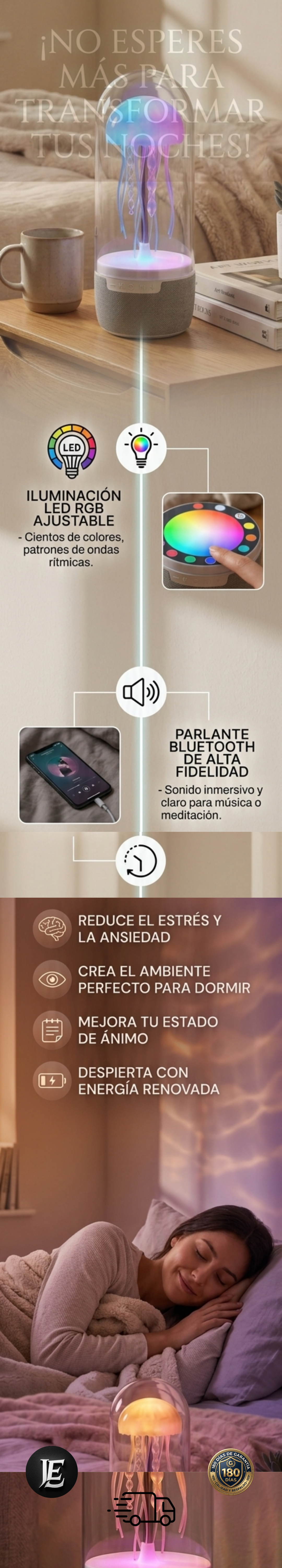 Sí, este modelo cuenta con luces LED que permiten alternar entre diferentes tonalidades y efectos. Su diseño de medusa crea un movimiento visual relajante que, combinado con la luz, transforma cualquier habitación en un espacio de calma y diseño premium.