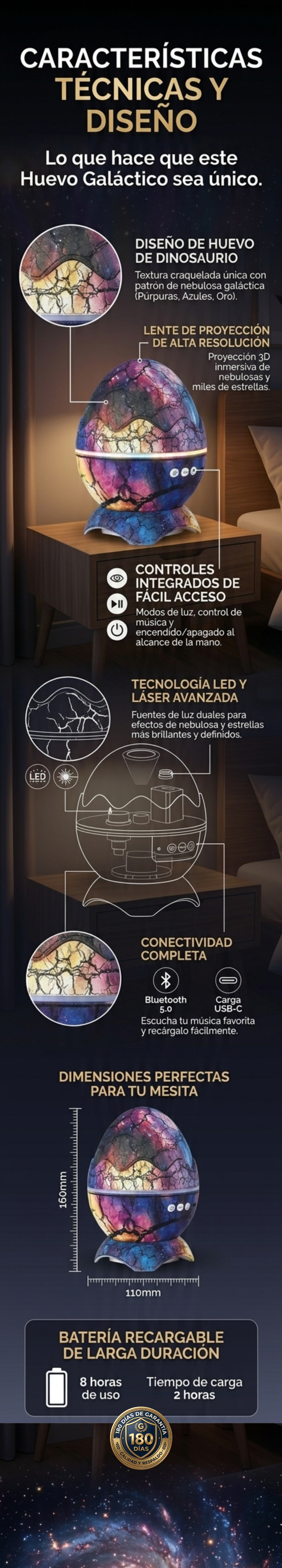 Este velador proyecta un cielo estrellado y nebulosas en 360°, transformando cualquier habitación en un espacio mágico. Cuenta con múltiples modos de color y niveles de brillo ajustables directamente desde sus botones frontales o control remoto (si incluye).