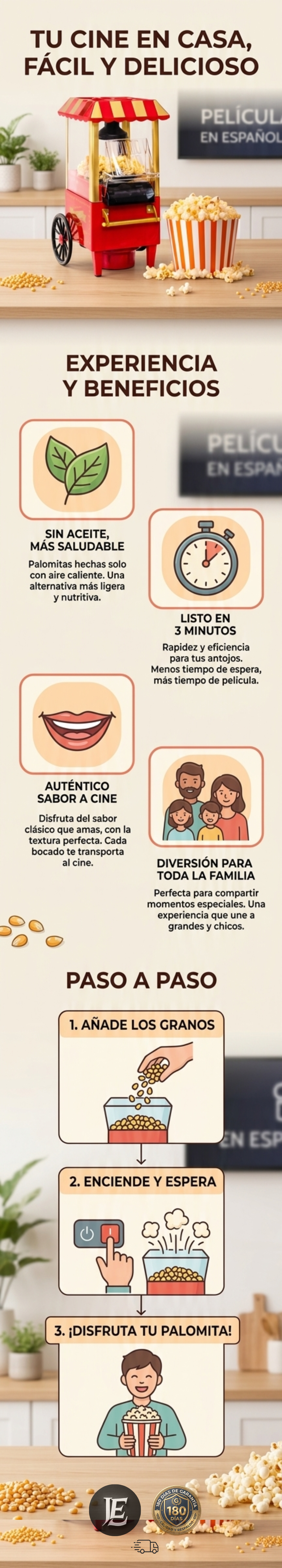 Gracias a su potencia, podés disfrutar de una tanda completa de pochoclos en aproximadamente 2 a 3 minutos. Es ideal para noches de películas en casa debido a su rapidez y facilidad de uso.